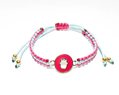 Pulseira em macrame com linha de seda nas cores turquesa e pink.